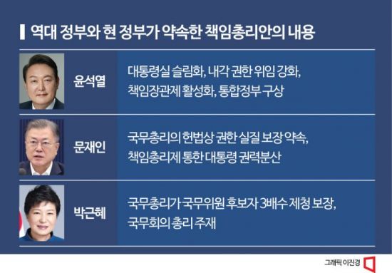 현실화되는 경우는 드물었다. 박근혜 전 대통령은 총리가 국무위원 후보자 3배수를 추천할 수 있도록 보장하는 내용을 공약으로 구체화했다. 하지만 총리와 장관 인선이 동시에 진행되는 경우가 많아 사실상 백지화됐다. 문재인 전 대통령도 ‘국무총리의 헌법상 권한을 실질적으로 보장하겠다’고 약속했다. 그러나 조국 전 장관 임명 과정에 이낙연 전 총리의 반대 건의는 받아들여지지 않았다.