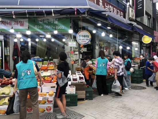 BPA 직원 8명과 어린이 8명은 1:1로 짝을 이뤄 부산 동구 수정시장을 찾았다. 아이들은 직원의 도움을 받아 물건 가격을 알아보고 온누리상품권을 이용해 직접 채소와 과일을 구입했다.