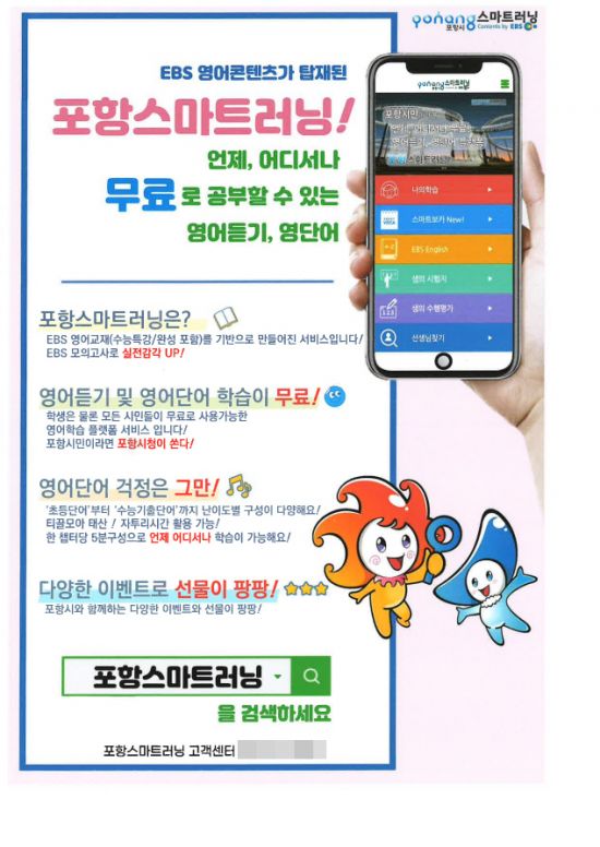 이 사업은 올해 처음 시행하는 사업으로 포항시민 누구나 ‘포항스마트러닝’ 애플리케이션 또는 포항시 전용 웹사이트에 접속해 회원가입 후 무료로 이용할 수 있다. 회원가입 등 관련 문의는 포항스마트러닝 고객센터로 연락하면 된다.