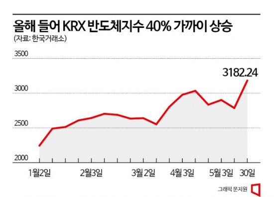 주요 종목을 살펴보면 시가총액 기준 반도체 대장주인 삼성전자는 7만원대로 올라서며 27%가량 상승했다. SK하이닉스는 7만원대에서 11만원대로 44% 넘게 올랐다. 소재, 부품, 장비 업체들도 가릴 것 없이 일제히 오름세를 보였다. 한미반도체는 140% 급등했고, DB하이텍(68%), LX세미콘(56%), 하나머티리얼즈(45%), 테스(43%), 해성디에스(44%), 이오테크닉스(39%), 원익IPS(29%), 덕산네오룩스(13.6%)등이 오름세를 보였다.