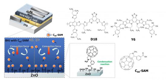 연구팀은 단분자 물질인 ‘풀러렌 기반 자기조립 소재(C60-SAM)’를 산화아연 위에 도포해 스스로 보호층을 형성하게 함으로써 산화아연의 안정성을 확보하고 전지의 효율과 수명을 개선했을 뿐만 아니라 코팅 공정을 간소화하는 데도 성공했다. C60-SAM은 산화아연과 만나면 표면에 얇은 층을 형성하는 점을 이용했다. 연구팀은 C60-SAM을 광활성 물질에 혼합해서 코팅하고 산화아연과의 반응을 통해 스스로 보호층을 형성하게 했다. C60-SAM의 카르복실산 말단기와 산화아연 표면의 하이드록실기 사이에서 축합반응이 일어나 그사이에 보호층이 안정적으로 형성될 수 있었다.
