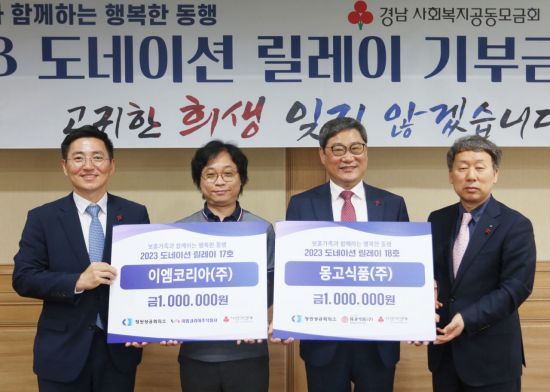 이엠코리아와 몽고식품은 최근 창원상공회의소와 경남사회복지공동모금회가 공동 추진하고 있는 보훈 가족과 함께하는 행복한 동행 ‘2023 도네이션 릴레이 캠페인’의 17호, 18호 동행자로 참여해 기부금 100만원을 각각 전달했다.