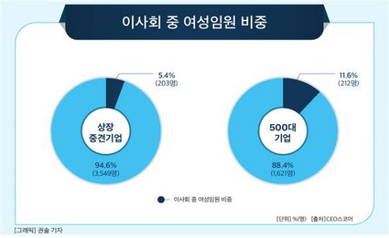 이사회 내 여성 비율은 상장 중견기업이 대기업보다 낮았다. 상장 중견기업 이사회 내 여성 비율은 5.4%(203명)였다. 500대 기업 11.6%(212명)의 절반에도 못 미쳤다. 여성이사를 1명 이상 선임한 상장 중견기업은 161곳(22.3%)이었다. 대기업 61.9%(166곳)이 여성이사를 1명 이상 선임했다.