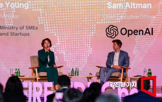 이영 중소벤처기업부 장관이 9일 서울 여의도 63스퀘어에서 열린 'K-스타트업 미트 오픈 AI'에 참석해 챗GPT로 생성형 인공지능(AI) 붐을 일으킨 샘 올트먼 오픈AI 최고경영자와 대담을 하고 있다. 사진=강진형 기자aymsdream@