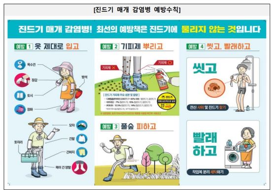 농작업이 끝났다면 작업복은 충분히 털어내고 바로 세탁해야 한다. 몸을 씻으면서 벌레 물린 상처나 진드기가 붙어있는지 꼼꼼하게 확인해야 한다. 질병청 관계자는 "만약 몸에 진드기가 붙어있을 경우, 손톱으로 진드기를 터뜨리거나 무리해서 떼어내려 하면 진드기의 혈액에 의해 추가 감염 우려가 있으므로, 가까운 보건소나 의료기관에 방문해 제거해야 한다"고 말했다.