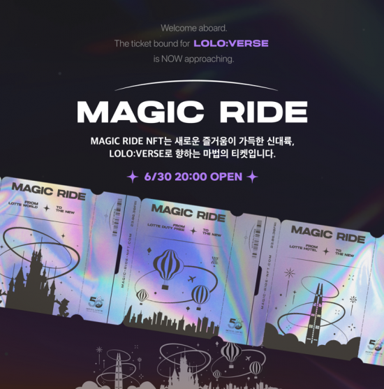 롯데호텔군HQ는 오는 30일 오후 8시 '매직라이드 대체불가토큰(NFT)'을 출시하고 호텔롯데 NFT 세계관을 펼친다고 22일 밝혔다. 롯데호텔, 롯데면세점, 롯데월드가 공동으로 참여해 NFT 홀더(소유자)들에게 새로운 웹3.0 경험을 제공할 예정이다.