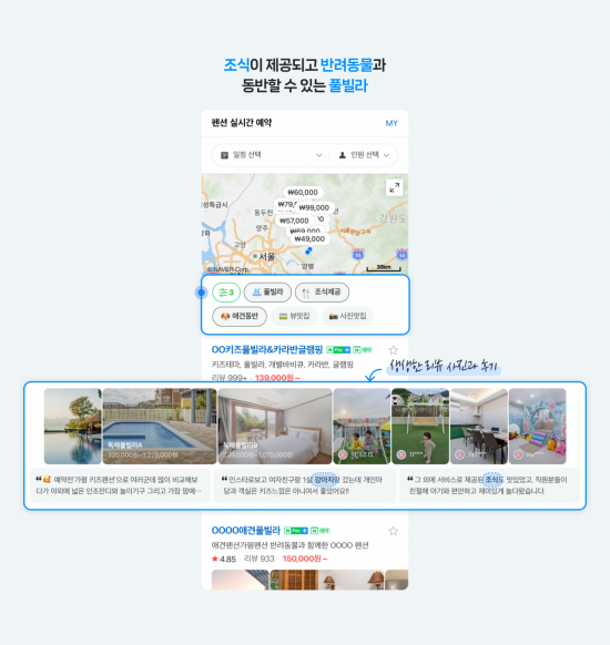 이용자들이 플레이스에 남긴 키워드, 텍스트, 이미지 등 다양한 리뷰 콘텐츠를 검색 결과에 반영했다. 실제 방문 경험에 따른 숙소의 특징들도 고려해 검색 결과를 제공한다. 예를 들어 '제주도 오션뷰 가족펜션', '가평 분위기 좋은 캠핑장'과 같은 구체적인 질의에도 이용자의 니즈를 충족하는 숙소를 제시한다.