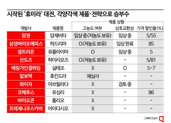 미국 '휴미라(성분명 아달리무맙)' 바이오시밀러(바이오의약품) 시장의 문이 드디어 열렸다. 24조5000억원에 달하는 미국 시장을 두고 전략에 따라 다양한 가격이 매겨지 있고, 제품 선택 과정에서 농도·부작용 개선 여부 등 다양한 요소가 존재해 치열한 전략 싸움이 벌어지고 있다.
