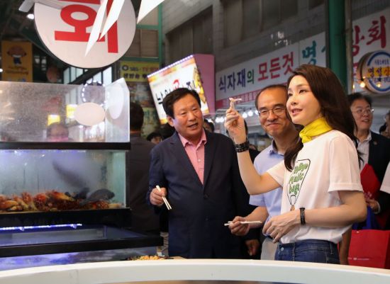 김 여사는 먼저 횟집에 들러 오징어회, 멍게, 광어회 등을 구매했다. 후쿠시마 오염수 논란으로 수산물 소비가 줄어 들었지만 김 여사가 시장에서 회 등을 직접 시식하고 구매한 것은 오염수를 둘러싼 정치권의 논란을 의식한 것이라는 해석이 나온다.