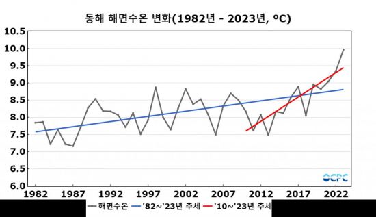 동해의 봄철 평균 수온은 1980년대 7.7℃, 2010년대는 8.3℃로 30년간 0.6℃ 상승한 것과 비교해 2021년부터 최근 3년간(2021년 9.0℃, 2022년 9.4℃, 2023년 10.0℃) 1℃ 상승하며 해면수온이 가파르게 상승하고 있다.