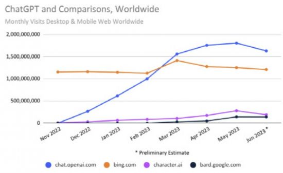생성 AI 붐의 진앙인 챗GPT 시대가 반년 만에 막을 내리는 걸까요. 작년 11월 혜성처럼 등장한 챗GPT 인기가 한풀 꺾였습니다. 트래픽 분석 업체 시밀러웹은 지난 6월 챗GPT의 글로벌 트래픽이 전월보다 9.7% 하락했다고 밝혔어요. 순방문자는 5.7% 줄었고 이용자들이 웹사이트에서 보낸 시간도 8.5% 감소했죠. 챗GPT를 탑재한 마이크로소프트(MS)의 빙 앱 다운로드 수는 38%나 빠졌습니다. 챗GPT의 각종 지표가 감소한 것은 서비스 출시 이후 처음이라고 하네요.
