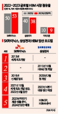 시장조사기관 트렌드포스는 지난해 말 기준 글로벌 HBM 시장 점유율을 SK하이닉스 50%, 삼성전자 40%, 마이크론 10%로 집계했다. 올해 점유율은 HBM3를 유일하게 양산하고 있는 SK하이닉스가 53%로 더 높아지고, 삼성전자는 38%로 내려갈 수 있다고 예상했다.