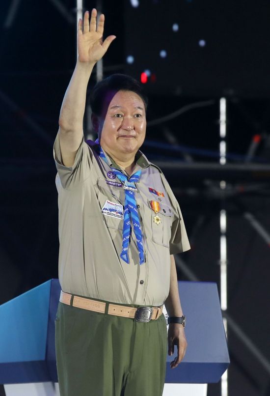 윤 대통령은 부인 김건희 여사와 함께 스카우트 복을 입고 개영식에 입장했다. 윤 대통령은 스카우트 대원 출신 최초의 대통령으로 지난 3월 한국스카우트연맹 명예총재직으로 추대됐다.