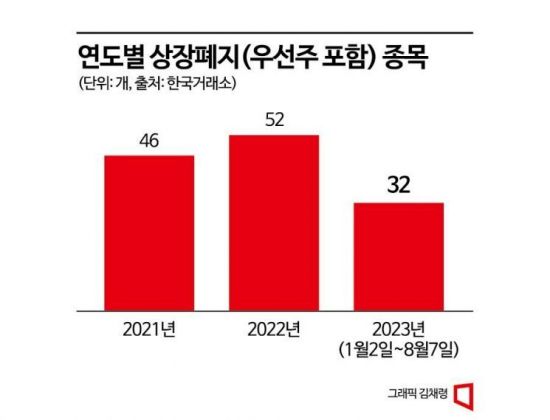 올 들어 7일까지 우선주 포함 32개 종목이 상장폐지됐다. 코스닥 상장사 엠피씨플러스를 시작으로 합병에 실패한 스팩(SPAC)들이 줄줄이 사라졌다. 오스템임플란트는 자진 상장폐지 사례다.
