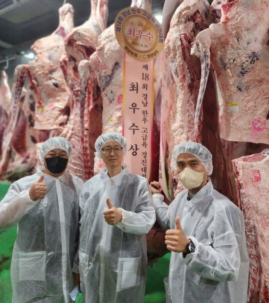 강문규 경제부본부장(가운데)과 정종윤 축산사업단장(오른쪽)이 제18회 한우고급육 경진대회에서 최우수로 선정된 서원길 농가의 출품우 앞에서 기념사진을 촬영하고 있다. [이미지제공=경남농협]
