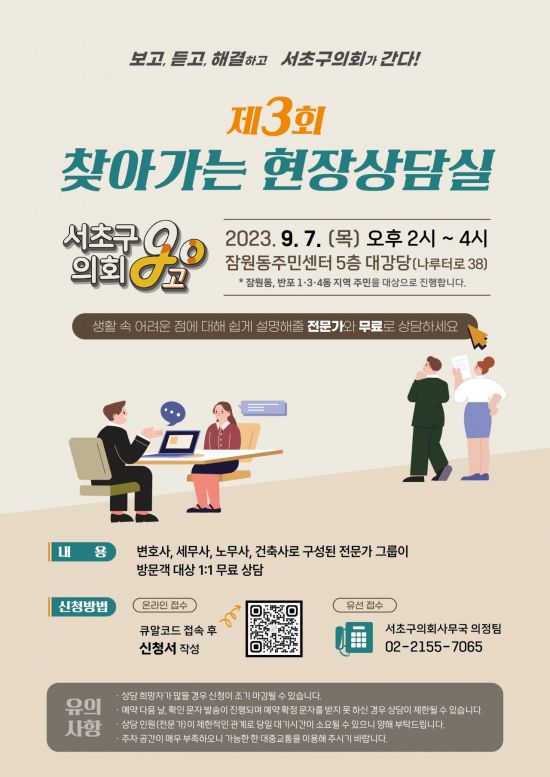 이번 현장상담실은 잠원동과 반포1·3·4동 구민을 대상으로 오는 9월 7일 잠원동주민센터에서 열린다. 현장상담실에서는 법률·세무·노무·건축 등 분야별 전문가에게 1:1 무료 상담을 받을 수 있다. 신청은 큐알코드를 활용한 온라인 접수와 유선 접수로 가능하다.