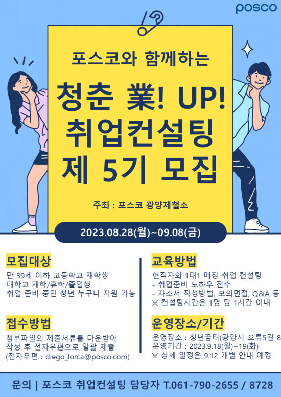 포스코 광양제철소(소장 이진수)가 8월 28일부터 9월 8일까지 ‘청춘業! UP! 취업컨설팅’ 5기 참여자 모집에 나선다.