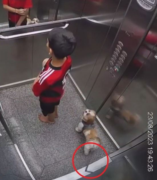 이 사실을 알아챈 소년이 황급히 뒤돌아 목줄을 움켜쥐었지만, 엘리베이터가 움직이면서 반려견은 목줄에 딸려 천장으로 올라갔다. 그대로 두면 반려견이 질식할 수 있는 상황이었지만 소년도 공중에 뜬 상태로 목줄을 잡아당겼다. 결국 목줄이 끊어지면서 이 소년과 반려견은 바닥으로 떨어졌다.