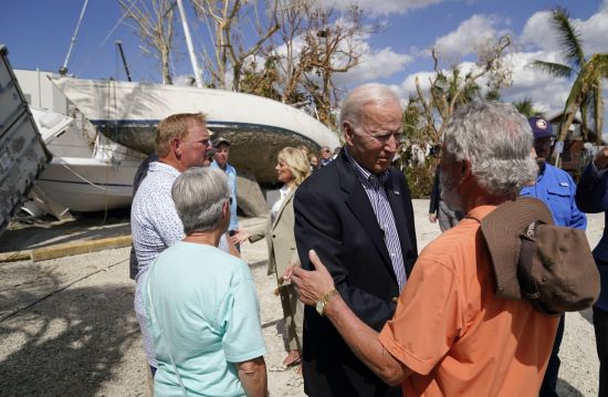 조 바이든 미국 대통령(오른쪽에서 두 번째)이 지난해 10월 5일(현지시간) 허리케인 '이언(Ian)'으로 피해를 본 플로리다주 포트마이어스 해변을 방문해 주민들과 이야기를 나누고 있다. [사진=포트마이어스 AP/연합뉴스]