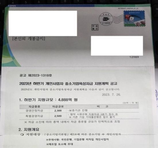개인사업자 안정자금 신청서·우편 도착 안내 등