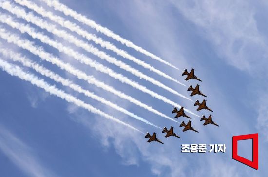 공군 특수비행팀 '블랙이글스'가 31일 오전 서울 도심 상공에서 제75주년 국군의 날 축하비행 예행연습을 하고 있다. 사진=조용준 기자 jun21@