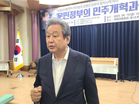 김무성 전 새누리당(국민의힘 전신) 대표가 15일 국회에서 열린 '문민정부의 민주개혁과 성숙한 민주주의' 세미나에 참석한 뒤 취재진의 질문에 답하고 있다. 2023.9.15 [이미지출처=연합뉴스]