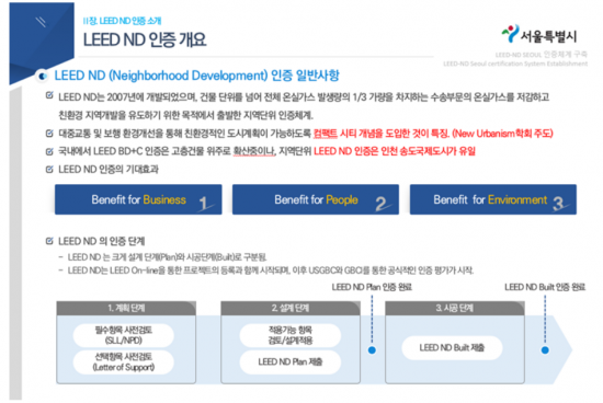 시는 그간 도시 내 탄소배출량 저감 및 지속가능성 확보를 위해 인증제도를 건물 단위 중심으로 운영해왔다. 하지만 블록이나 지역 차원의 종합적인 친환경 계획수립을 유도할 수 있는 제도는 마련되지 않았다. 이에 시는 전 세계적으로 널리 공인된 LEED를 기반으로 지역개발 수준의 넓은 범위에 대한 개발사업 계획을 평가?인증 할 수 있는 제도 도입을 국내 최초로 추진할 계획이다.
