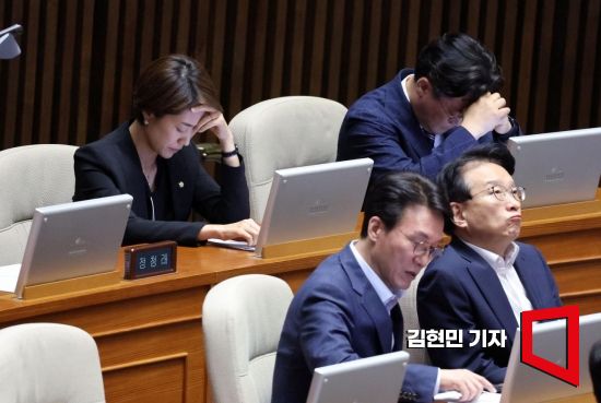 고민정 더불어민주당 최고위원 등이 21일 국회 본회의장에서 이재명 대표 체포동의안이 가결되자 침통한 표정을 짓고 있다. 사진=김현민 기자 kimhyun81@
