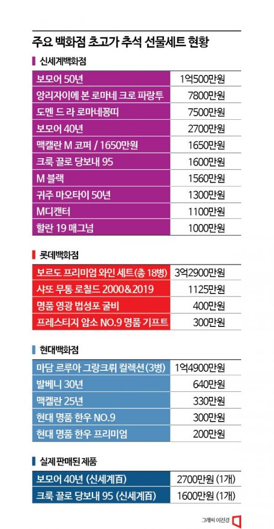 한편 올해 롯데백화점에선 프랑스 보르도 프리미엄 와인으로 구성된 ‘샤또 페트뤼스 버티컬'(2001~2018 빈티지 18병)을 3억2900만원에 선보였다. 빈티지를 조합한 프랑스 대표 와인 ‘샤또 무통 로칠드 2000&2019'는 1125만원에 준비했다. 현대백화점은 ‘발베니 30년’(640만원)을, 갤러리아는 ‘테세롱 꼬냑 뀌베 익스트림(2700만원)’과 와인 ‘꼬쉬 뒤리 뫼르소 세트(700만원)’등의 상품으로 구성했다. 이외에도 신세계는 50년 숙성 고량주 ‘귀주 마오타이(1300만원)’, 위스키 맥캘란의 프리미엄 라인인 'M 코퍼(1650만원), 'M디캔터(1100만원)', 'M디캔터블랙(1560만원)'과 와인 '도멘 드 라 로마네꽁띠(7500만원)' 등도 준비했다.