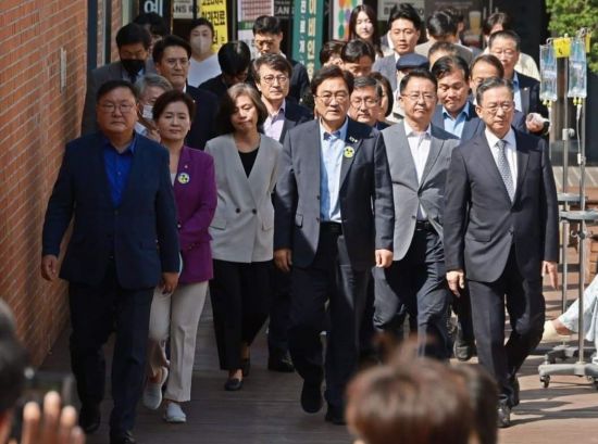 김 의원은 해당 게시글 하단에 "아래 사진은 어제 이재명 대표를 찾아가 단식을 만류하고 돌아오는 모습입니다"라며 전날 민주당 인사들과 함께 이 대표를 방문하고 병원을 나오는 사진을 게시했다.