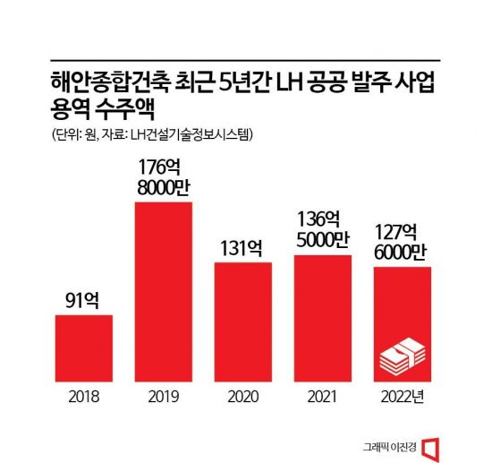실제로 LH건설기술정보시스템에 따르면 해안종합건축은 2013년부터 올해 6월까지 LH가 발주한 공공 발주 사업 20건(총 용역비 920억원)을 수주했는데, 최근 몇 년 사이 본격적으로 수주 용역비가 급증했다.