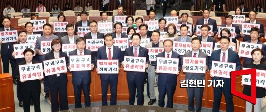 국민의힘 김기현 대표와 윤재옥 원내대표 등이 27일 국회에서 열린 의원총회에서 더불어민주당 이재명 대표 영장 기각 규탄 구호를 외치고 있다. 사진=김현민 기자 kimhyun81@