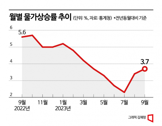 5일 통계청이 발표한 '9월 소비자물가동향'에 따르면 지난달 소비자물가지수는 112.99로 전년 동월 대비 3.7% 상승했다. 이는 전월 대비 0.3%포인트 오른 수치며, 지난 4월(3.7%) 이후 5개월 만에 최대 폭 상승률이다. 올해 1월 5.2%를 기록한 소비자물가 상승률은 지난 7월 2.3%까지 둔화했다가, 지난달 3.4%를 기록한 후 상승 폭이 더 커졌다.