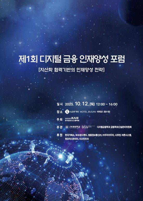 부경대·동서대 공동학과 신설준비위원회와 한국정보시스템학회가 주관하는 ‘제1회 디지털 금융 인재 양성 포럼’이 12일 오후 1시 30분부터 부산롯데호텔 41층 에메랄드 룸에서 열린다.