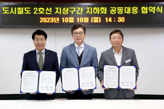 서울 성동구(구청장 정원오)는 16일 도시철도 2호선 지상구간 지하화에 공동 대응하기 위해 ‘성동-송파-광진’ 3개 자치구가 업무협약(MOU)을 체결했다고 밝혔다.