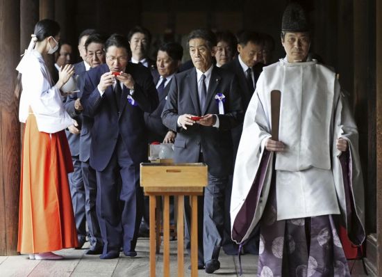 일본 국회의원들이 15일 2차 세계대전 A급 전범이 합사된 도쿄 야스쿠니 신사에서 전몰자들을 위해 기도한 후 이동하고 있다. 기시다 후미오 일본 총리는 이 신사에 직접 방문하진 않았으나 이날 오전 일본 패전일을 맞아 공물료를 봉납했다. [이미지출처=연합뉴스]