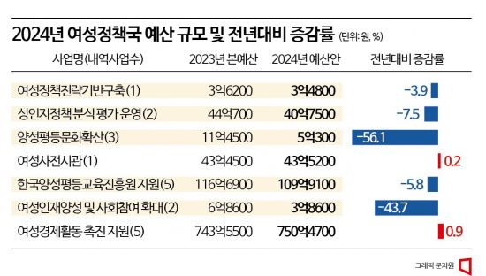 양이원영 더불어민주당 의원실이 2일 여성가족부로부터 제출받은 '여성정책국 2024년 예산안 전년 대비 증감액 세부내역'에 따르면 여성정책국에서 집행하는 사업(내역사업별) 19개 중 11개가 감액된 것으로 나타났다. 감액 대상 중 대부분은 양성평등 관련 사업(9개)에 해당한다. 또 권익보호 관련 사업(2개)도 감액됐다.