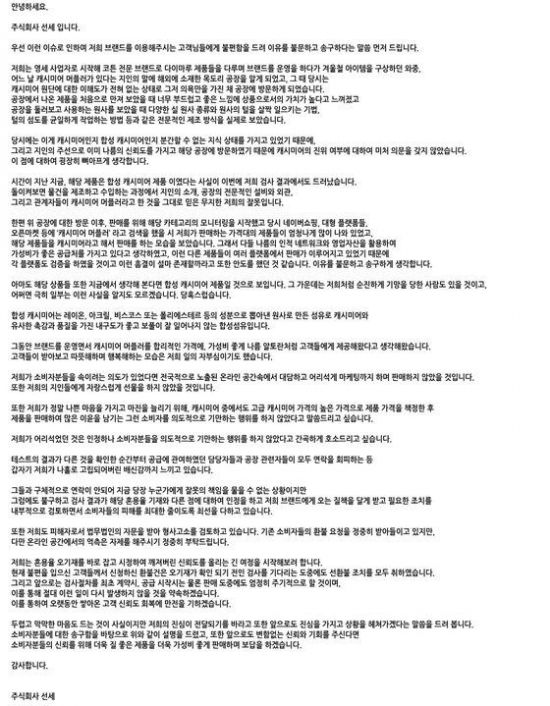 업체는 자신들도 피해자라면서 “저희가 소비자분들을 속이려는 의도가 있었다면 전국적으로 노출된 온라인 공간 속에서 대담하고 어리석게 마케팅까지 하며 판매하지 않았을 것”이라며 “온라인 공간에서의 억측은 자제를 해주시기 정중히 부탁드린다”고 했다.