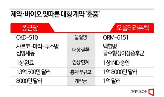 6일 오전 종근당은 노바티스와 최대 계약 규모 13억500만달러(약 1조7302억원), 계약금 8000만달러(약 1061억원)에 히스톤디아세틸화효소6(HDAC6) 저해제인 'CKD-510'을 수출한다고 밝혔다. 이어 바로 이날 늦은 저녁에는 오름테라퓨틱이 총액 1억8000만달러(약 2336억원), 계약금 1억달러(약 1298억원)에 급성 골수성 백혈병(AML)·고위험 골수형성이상증후군 환자 치료제인 'ORM-6151'을 기술수출했다고 밝혔다.