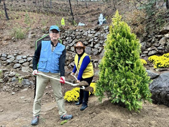 16일 양극재 광양공장 인근 계족산에서 열린 첫 식재행사에서 포스코퓨처엠 김준형 사장(사진 왼쪽)과 모이라 사회적협동조합 양재순 이사장이 편백나무 묘목을 식수하고 있다. 사진제공=포스코퓨처엠