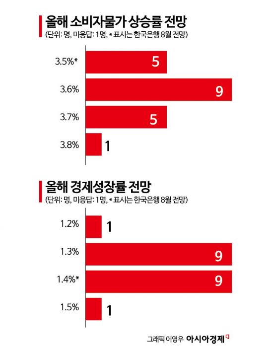 아시아경제가 27일 국내외 증권사 애널리스트와 은행·경제연구소 연구원 21명을 대상으로 설문조사를 진행한 결과 올해와 내년 소비자물가 전망치가 기존 8월 한은 전망치를 넘어설 것이라 판단한 응답자가 각각 15명, 9명으로 집계됐다. 한은은 오는 30일 수정경제전망을 발표하는데, 지난 8월 한은이 내놓은 올해와 내년의 소비자물가 상승률은 각각 3.5%와 2.4%였다. 올해와 내년 경제성장률 전망치는 각각 1.4%, 2.2%였다.