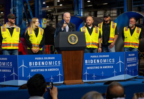 바이든 대통령은 29일(현지시간) 콜로라도주 푸에블로에 있는 한국 풍력타워 제조사인 CS윈드를 찾았다. 공장에는 '바이드노믹스, 미국에 투자'라고 쓰인 배너가 걸려있었고, 바이든 대통령은 생산 공정에 대한 브리핑을 받았다.