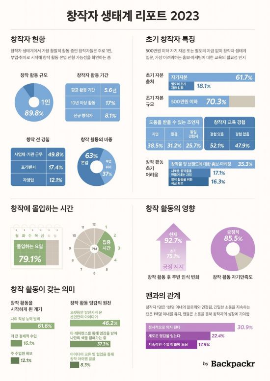 아이디어스, 텀블벅, 스테디오 등 플랫폼을 기반으로 활동하는 창작자 중 89.8%가 홀로 일하고 있는 것으로 조사됐다. 1일 백패커(대표 김동환)는 창작자들의 활동을 지원하고 지속 가능한 생태계를 만들기 위한 보고서 '2023 국내 창작자 생태계 리포트'를 발표했다.