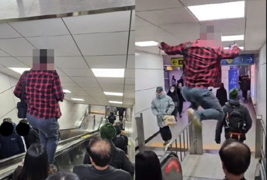 영상에서 빨간색, 남색의 체크무늬 남방을 입은 남성은 에스컬레이터에 가득한 사람들 옆에서도 아랑곳하지 않고 손잡이 위에서 곡예를 부렸다. 경사가 가파른 에스컬레이터의 손바닥 너비도 채 안 되는 손잡이 위에 위태롭게 서 있는 남성은 매우 위험해 보인다. 자칫 이 남성이 손잡이 위에서 떨어지면 큰 사고로 이어져 다른 시민에게도 충분히 피해가 갈 수 있는 상황이었다.