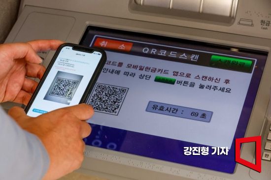 6일 서울 중구 신한은행 본점 현금자동입출금기(ATM)에서 고객이 모바일 뱅킹 앱의 QR코드를 활용해 출금을 하고 있다.