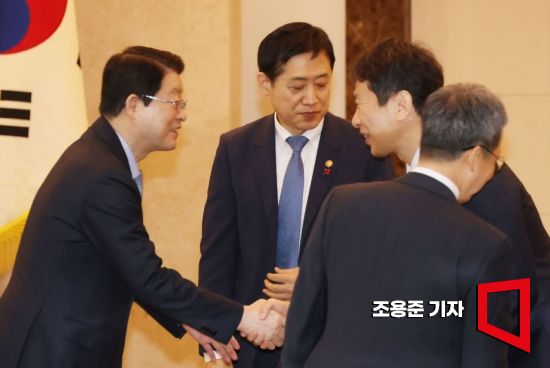 6일 서울 종로구 정부서울청사에서 열린 금융회, 금감원 보험업계 CEO간담회에서 이복현 금감원장이 정희수 생명보험협회장과 악수를 하고 있다. 이날 회의는비공개로 진행됐다. 사진=조용준 기자 jun21@