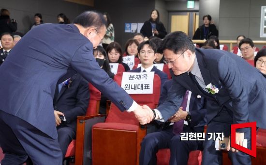 윤재옥 국민의힘 원내대표와 홍익표 더불어민주당 원내대표가 6일 국회 의원회관에서 열린 제5회 대한민국 동물복지대상에서 만나 인사하고 있다. 사진=김현민 기자 kimhyun81@