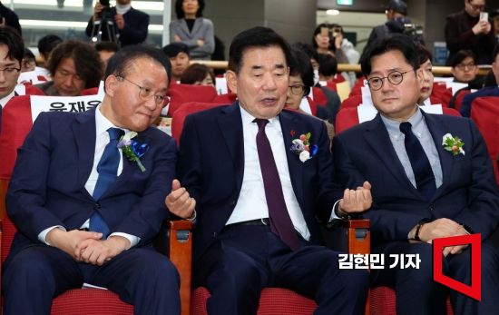 김진표 국회의장(가운데)와 윤재옥 국민의힘 원내대표, 홍익표 더불어민주당 원내대표가 6일 국회 의원회관에서 열린 제5회 대한민국 동물복지대상에서 대화하고 있다. 사진=김현민 기자 kimhyun81@