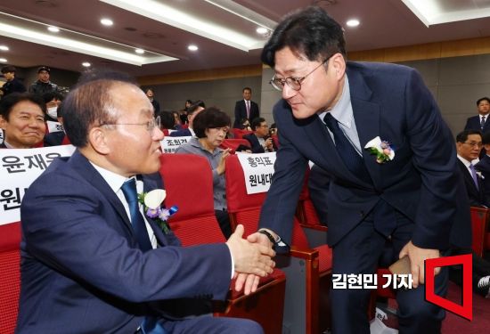홍익표 더불어민주당 원내대표가 6일 국회 의원회관에서 열린 제5회 대한민국 동물복지대상에서 나서며 윤재옥 국민의힘 원내대표와 인사하고 있다. 사진=김현민 기자 kimhyun81@