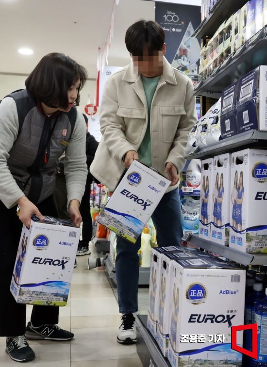 6일 서울 송파구 롯데마트 월드타워점에서 한 직원이 고객으로 부터 요소수관련 질문을 받고 있다. 사진=조용준 기자 jun21@